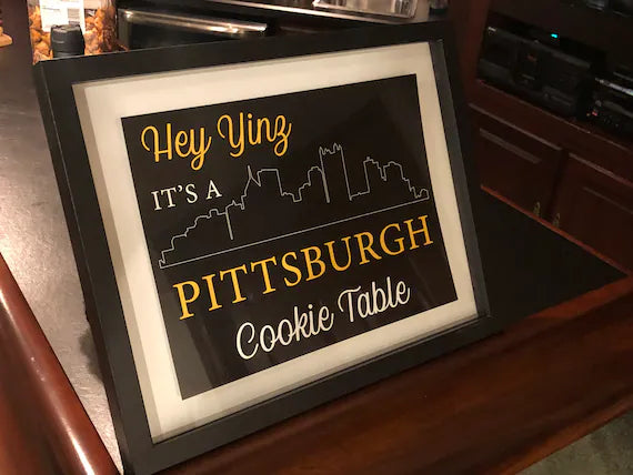 Framed shadowbox 11x14 Pittsburgh Cookie Table print. Will need an easel to display. Frames with kickstand available.